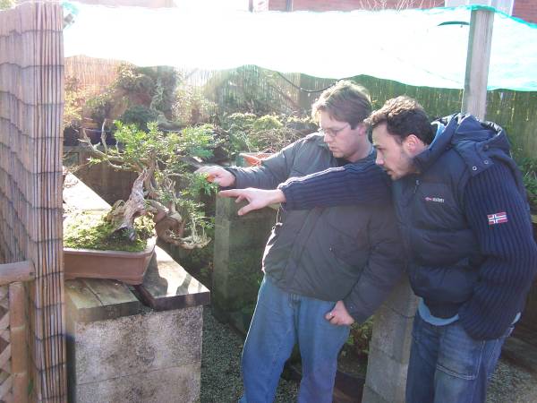 Below: Later that morning we were joined by Tony, Enrico and Ivo. Under the pleasure of warm coffee and croissants, Enrico and Ivo had a long look at Terry’s trees, Especially this old and very twisted “Yew” had their intention!
