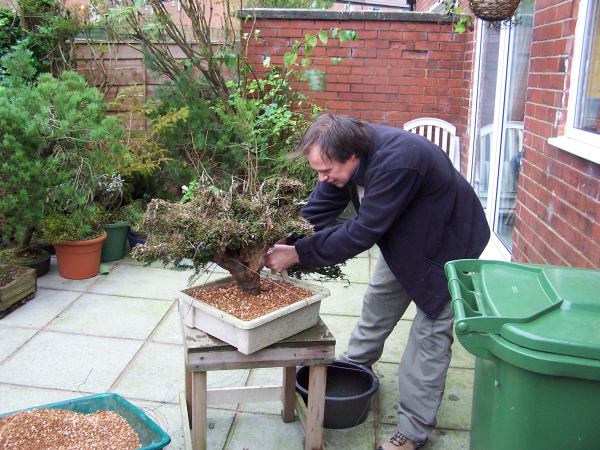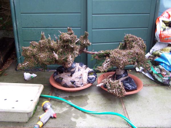Below: Sorry for the poor quality of the next 3 pictures, bud it was very stormy and I was very cold! LOL. The 3 “Yews” were left soaking in water overnight, so their roots could fill up with water. Then early the next morning, Terry and I planted them in suitable plastic containers (look at the amazing roots), in a mixture of Akadama and Biosorb (cat litre). Terry is an expert in these little gems, so I let him do most of the work. LOL. The trees were firmly attached in their containers so that there would be no change of root damage when moved.