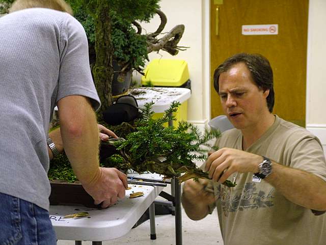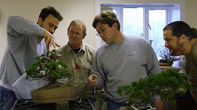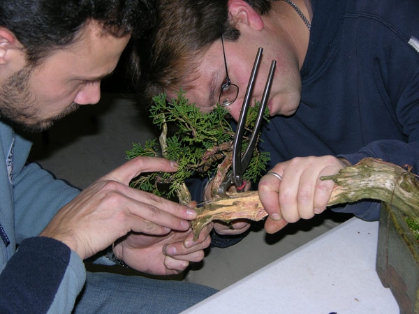 Below: Ivo and Enrico discussing John’s “Itoigawa Juniper” and me on the right ears dropping.