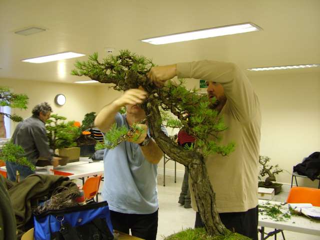Enrico and Ivo demonstrated on Tony’s Big Yamadori “Scots Pine”. It was an enormous transformation, made possible by Enrico’s great technical knowledge and beautiful style. Some extreme heavy bending was done by these two, and it was great fun for me to throw a heavy metal oven tray on the floor behind them, while they were very concentrated bending the thickest branch! Boy, can those Italians jump high! LOL :). The outcome of their hard work was absolutely amazing!