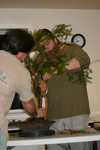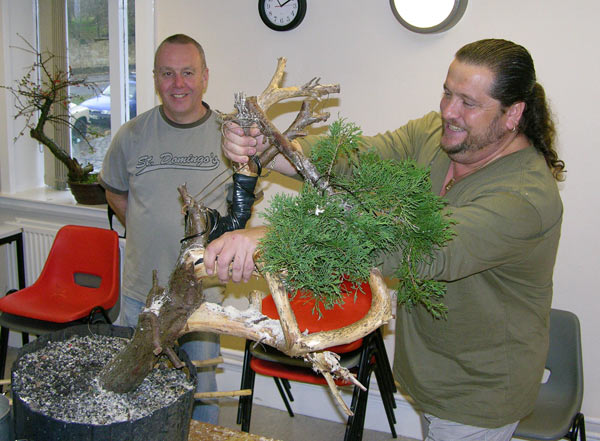 Below: Me bending Daves’s “Juniper” and Ian is waiting for it to snap! The branch was hollowed out and filled with lengths of aluminium wire, then raffia and tape to protect it from breaking.