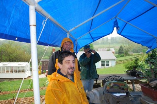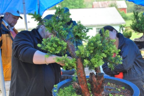 Below: Early in the morning and the first students for the demo and workshop arrive. Tom’s “SHADY SIDE BONSAI” is so big that he (on the left) and Rich (on the right) had to load Rich his BIG Yew onto the back of a small tractor to bring it up the hill, to his outdoor working area.