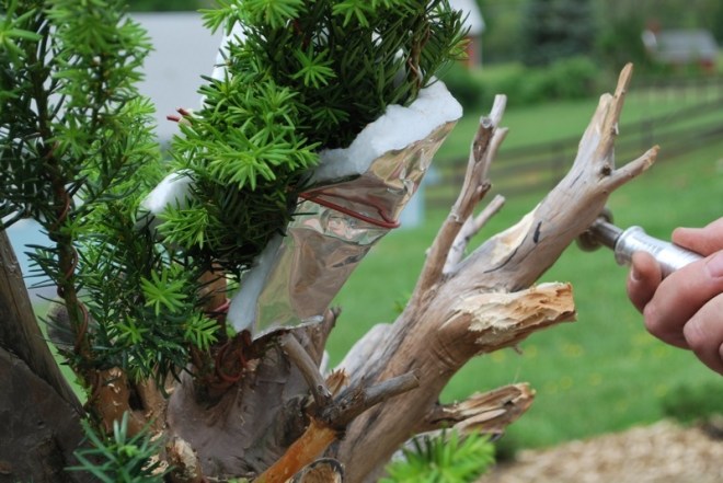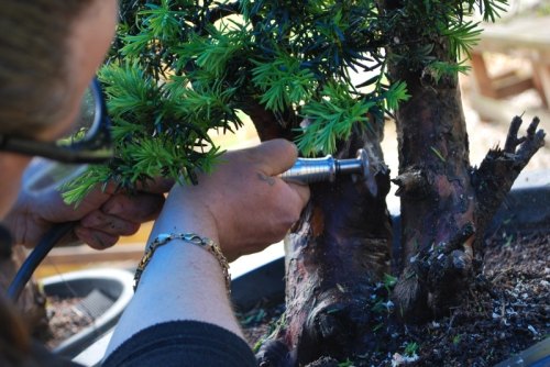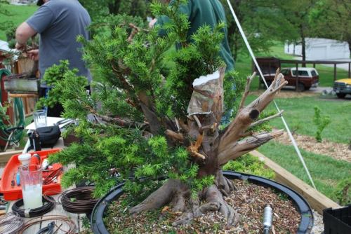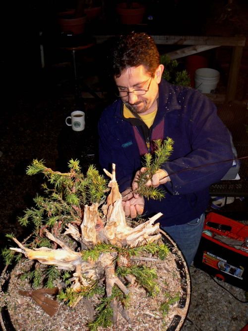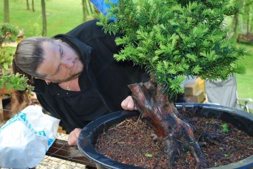 Below: Here I am checking out the possibilities for this lovely but difficult two trunk Yew Tom provided me with for my morning demo.