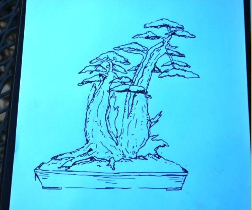 Below: After most of that excess wood was reduced and the trunks looked better in balance with its other I was able to make my design for this mother and child Yew. This is the drawing of the design I came up with. I almost always make these sketches of my designs. It helps me to remember my first thought, like a blueprint, before I start to think too much about thinks! Because of the lake of time and the health of the tree that should be protected at all times, most first styling during these demo’s are a bit rough and unfinished and don’t always show clearly what the end result of the future bonsai will be in a few years. These drawings are also pretty handy to show people what your future plans are with your tree! It makes explaining why I am using certain techniques to get to a certain point a lot easier if those people have a clear view of where I am working towards!