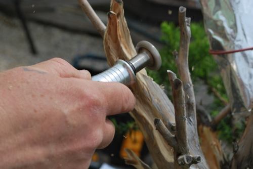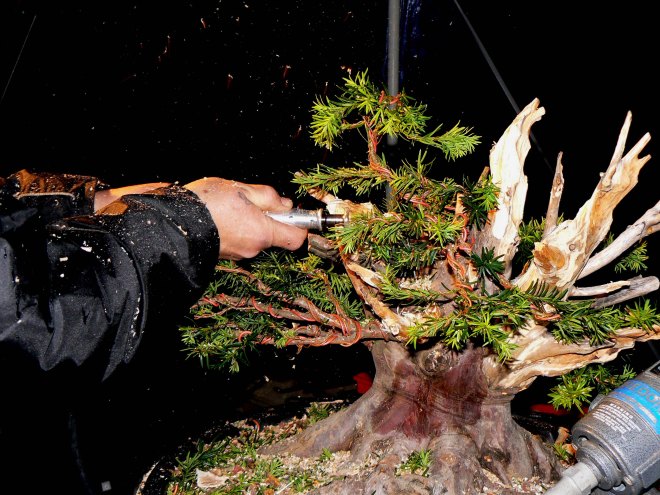 Below: Richy concentrated at work on the massive deadwood section                                             Below: With markers, lines were drawn on as a guideline for what Richy should remove and what not! Creating the rough shapes that later on (much later) would be refined into stunning Jin and Shari sections!
