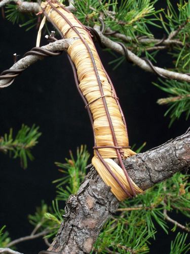 Left: The top section is protected with a tight layer of wet raffia. Then 4 pieces of copper wire are placed along it lengthwise.