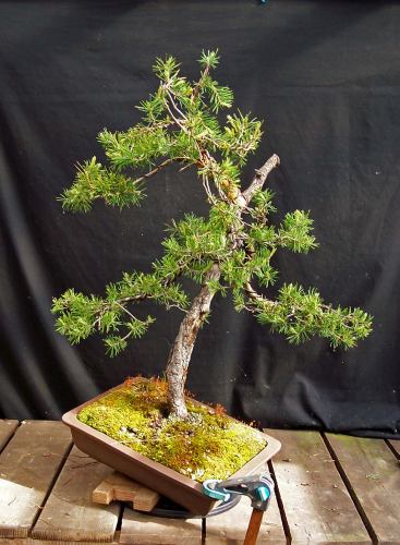 The final styling for now. I know that in my drawing I converted the right branch into a Jin, but for now, I decided to leave it on. It fits better into the design than I had expected, so I will see how it fits into the overall design after a couple of years. I can always cut it off later. There is no rush! It has become a bit of a strange design, balancing on the edge of dis balance. The branch placement and the length of some are also not common. But that is what makes this design interesting to me and I hope to the viewer as well!? The new movement of this tree and branches can be better appreciated in real life. For now, I am pleased with the outcome of the image for this difficult tree. And I hope that in a few years the tree is more presentable as a representation of an old and battered mountain Pine that I admired so much while walking through the European Alps! I also hope that this styling has proven again that you can make an interesting Bonsai from not the obvious and best material in the world! There is beauty to be found in almost everything!