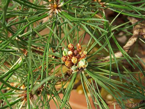 Just before this Bonsai was entered into the “Ginkgo Awards 2007”,  that was staged in early September, I pulled off the too long needles of the new growth/candles, that were sticking out too much. Leaving only a few needles on the now almost needleless candles. Now, I do, know that with more or less this same technique, the same result can be obtained on a Pinus Sylvestris. They will react to pulling off needles of new candles, just like they would do, when a deer nibbles off the fresh young needles, in early Summer. They will burst out in a multitude of new clustered buds. These new buds will later open up with much smaller needles than otherwise would be normal! But, that a Mugo Pine would react this strongly when its needles are pulled off as late as September, is news to me! So this is “Serendipity”, stumbling onto something good, by accident! 🙂