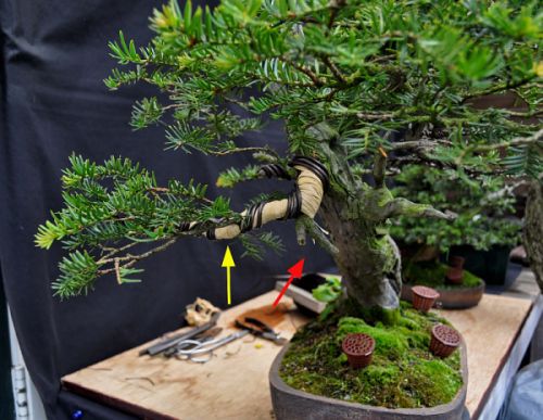 Below: The tree before styling. The live part of the left bottom branch is wrapped with a layer of water-soaked raffia. Then two lengths of 2.5mm aluminium wire were applied lengthwise on the outside of the future new curves. I need to bend this now backwards-growing branch as much to the front as possible. These two lengthwise placed wires will prevent the branch from breaking on the greatest stress point, the outside of the new