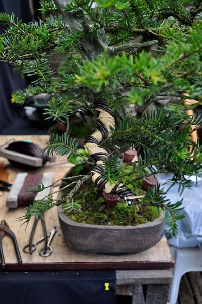 curves/bends that I will bring into the branch! That was followed by another layer of tightly applied raffia. And then finally two normal layers of 3,5mm aluminium wire were brought one! This should be enough to protect the branch from breaking, hopefully! Smile The long Jin you see in the front of that branch will be used as an anchor point for the