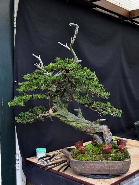 I would like to show you some pictures that were made a couple of days ago during the restyling of my old yew! This yew is very special to me because it is the first Yamadori that I ever collected. And this is how I was able to do so. During the first Ginkgo Awards in ’97, I met Tony Tickle and the gang for the first time. And let’s just say that it clicked from the start and leave it at that! Very Happy We had so much fun! So much so that we all together made the Japanese guest of honour faint during the prize presentation after the gala dinner! True story this! Anyway, during that same weekend, Tony had invited me to come and stay at his place for a weekend of fun and Yamadori trips! I gave it some serious thought for 0,009 off a second and then said in a high-pitched voice YES!!!! So in early 1998, I drove all the way to the North of England. And the Yew in this story was the very first tree that I collected on the first day! As you can see in the picture below that I was pretty happy and excited! Collecting this tree changed my future in Bonsai because it was the one that got me hooked on this way of doing Bonsai. So this tree holds a lot of warm memories in it! Not in the last place because of all the fun that I had with madman Tony!