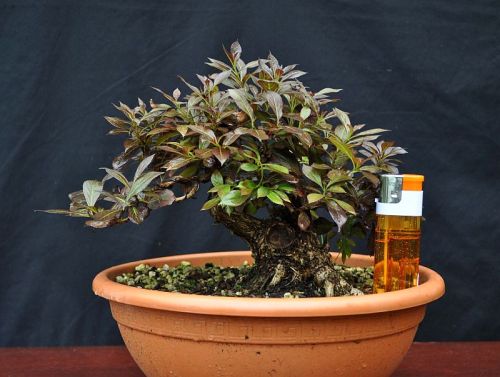 Today is finally a dry day, so I grabbed the change and repotted two of my trees. The first one I did was my Shohin Weigelia florida an urban yamadori that I bought as raw material in 2009.
