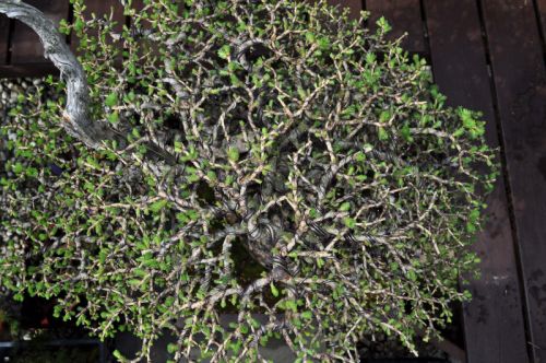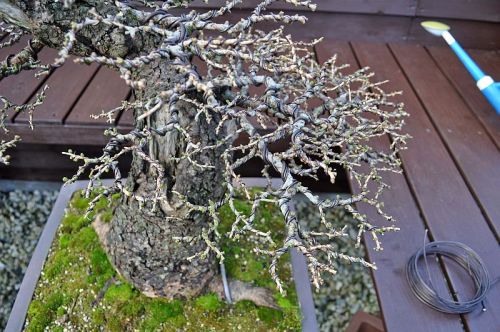 It is a calculated risk to wire this tree completely just before the growing season starts! I wired it pretty loose on purpose because I need the branches to grow as much as possible in this fixed position. The wire will be monitored constantly and will be cut as soon as it starts to dig in the bark! Then at the end of this growing season, all aluminium wire will be cut off (that’s another full day of work) and then the tree will be wired with copper wire again, but not the thick branches that are already pretty fixed in their positions. This is all in preparation for the next Noelanders trophy in January 2013. The day before that show all wire except the tiny ones on the small branches are cut off as well! And than hopefully all stay nicely in possition! ![]()