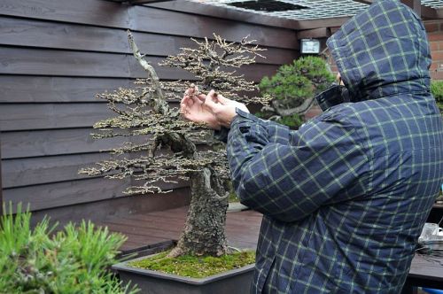 And then the buds on my Larch started to swell way earlier than last 3 years, and that meant trouble! When I finally finished painting my tables, I brought my Larch outdoor and started to carefully wire, without breaking off too many new buds! Well that was very tedious and time-consuming work, and on top of that, winter had returned as soon as I started to wire, and man it can get cold when you are standing still for hours to wire! And because of the tight ramification that I created my self during the last years, it was now almost impossible to get my big hands in between those branches to wire, without rubbing off a lot of buds!