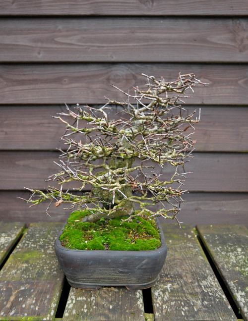 This little tree is without any wire for a long time now and some of the new smaller branches are growing in the wrong direction and needs to be wired in to place or cut back! The finer ramification that fills out and shapes the outline of the separate foliage pads has more than doubled over this last year and so far I am happy with the lower 80% off the ramification, but the top section needs to thicken some more and fill out a lot more to make me really HAPPY!! 🙂 But they don’t grow much when they are settled in a pot like this one is, so that will take at least two more growing seasons! Maybe just in time for the next Noelanders Kifu trophy?! The result of the root techniques I did last year is still covered with cut paste and soil and seem to do all right?! But we will know after this winter when I will have a closer look at the roots, I will keep you informed. I hope that the finer roots have grown enough to allow me to cut off some major thick roots so that I am able to remove two big rocks from the root ball! Then I can put it in a more shallower and suitable pot than this one. Although more suitable, some people really like this pot it is in now! Tony Tickle who was here last weekend loved the pot and he is not the only one! What do you guy’s think?! Note the pot is dirty in these pictures and normally it has a nice dark patina! I find it somewhat too high or too heavy, but in the future when the silhouette is more full, well than it might look just right?!