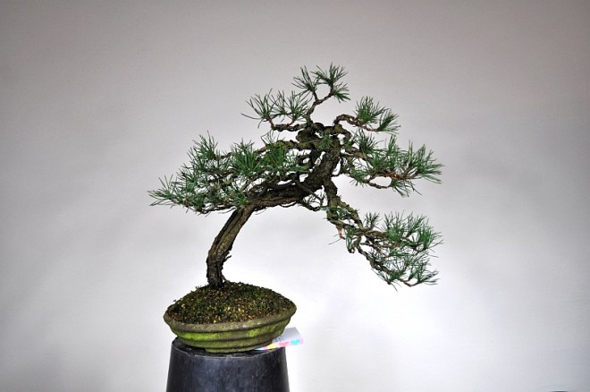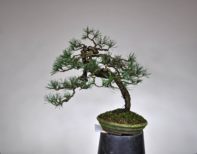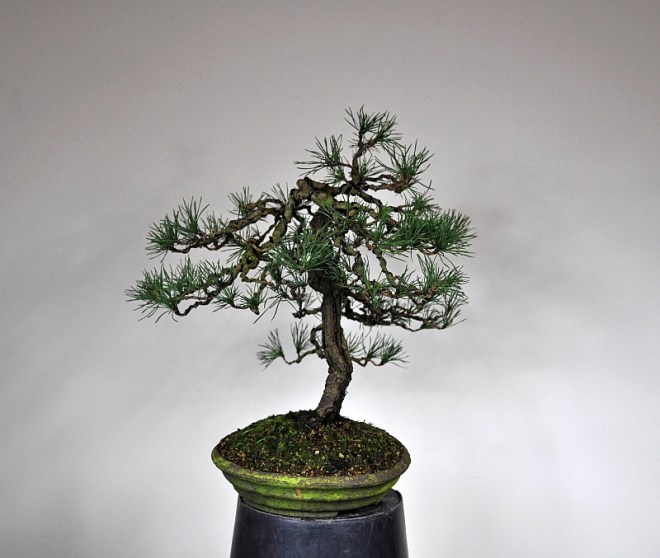 Below: and the finished front side view. I am really happy with just how mature this tinny Pine looks right now! If it is not yet sold next Spring, it will be repotted as soon as the buds start to swell back into the same pot. But a little bit more tilted to the left! And as soon as the weather clears I will clean the Shari section and Jin’s and treat them with lime sulfur.