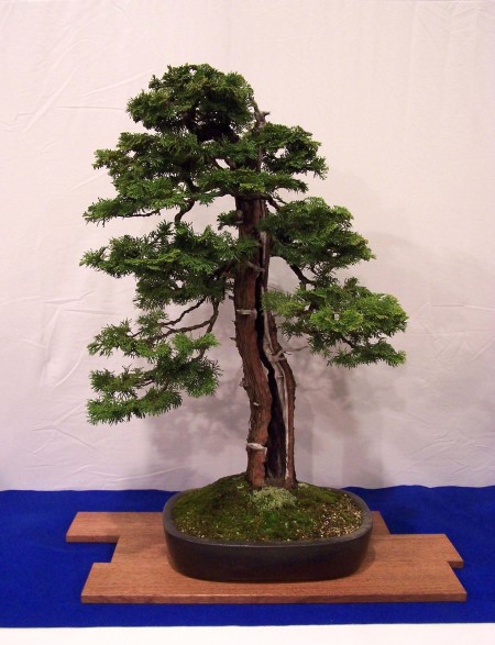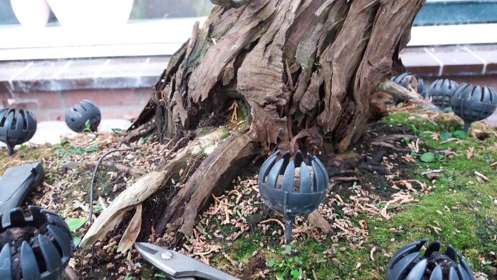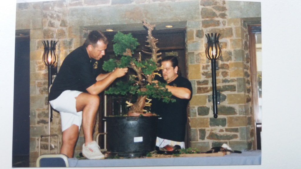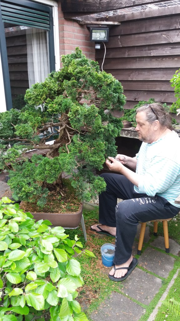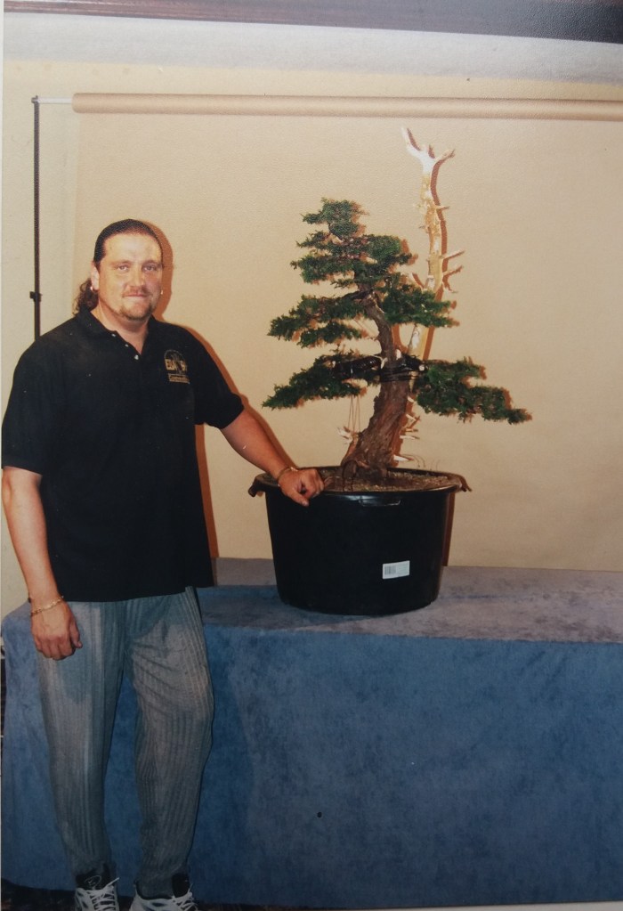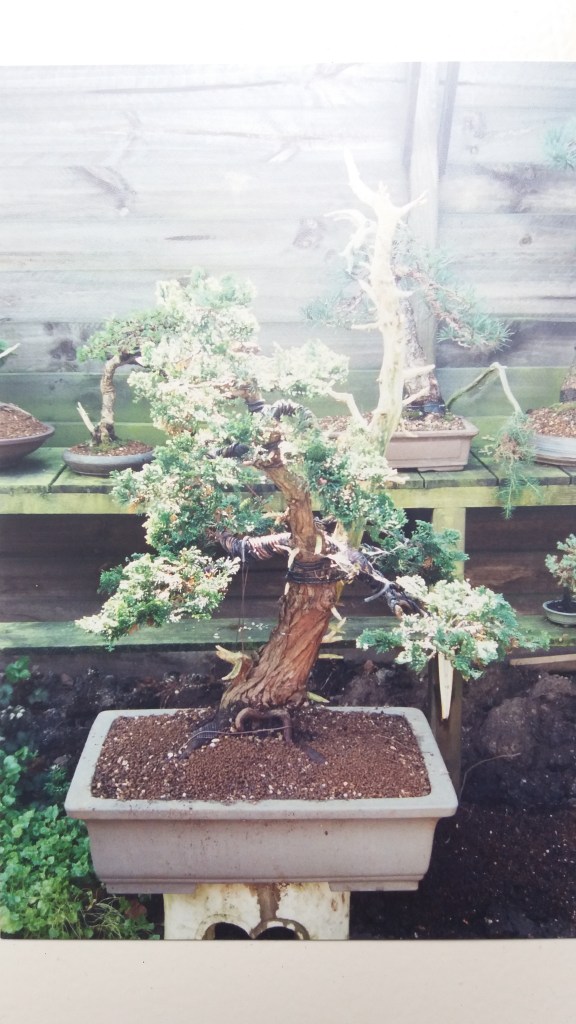 In 1998 I was invited to demonstrate at the 1999 E.B.A convention in Stratford Upon Avon and I immediately thought of my number 3 Chamaecyparis for my demo tree! It would be a big job to finish it in time, but I just had to try to style this so unique tree! Luckily my old friend Carlos van der Vaart helpt me (in amazing hot temperatures) to wire all those branches! My other old friend inventor of the “SAMURAI” carving tool William Vlaanderen was so kind as to bring this large tree with him on his bus. He had wrapped it tightly with plastic foil for the trip, but it had been so hot during his long trip that the poor tree had started evaporating enormously! So much so that all small branches had turned brittle and breakable! So extra care was necessary…but I made it in time!