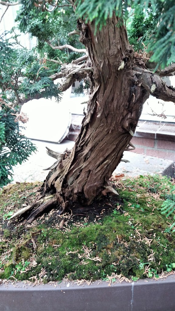 In the early 50 of the last century, growers in the little famous village “Boskoop” in Holland started to grow on a larch scale among others Chamaecyparis obtusa nana gracilis or Hinoki cypress. This species proved to be very hard to grow from cuttings so they started to graft them onto the much stronger and faster-growing Chamaecyparis lawsoniana. The survival rate was much higher and the plant has a higher survival rate. But because of that, the bottom root section/base of this new plant grew much faster than the top section and that is why we now still will almost always find older Chamaecyparis with overly large ugly bulging root bases! A second big problem with Chamaecyparis lawsoniana as a root base is that it is highly susceptible to the Phytophthora cinnamomi mould (root rot) and many invested fields needed to be destroyed because of this! But I am digressing! Anyhow…somewhere in the middle nighties I was visiting one of the literally hundreds of growers smack right in the middle of famous Boskoop. Where I started a conversation with the grower after he had been watching me for a while on my knees in the dirt looking under the bottom branches of a mighty original Chamaecyparis obtusa nana gracilis. He asked me why I was so interested in just this field full of old Hinoki’s? I explained enthusiastically just why I loved them and why I wanted to use them if I had one! And then he told me the story of how he as a jong boy in the 50ties had planted this, then much larger field, together with his father! And that since then over the last 40+ years literary thousand cuttings were taken from these so-called “Mother” plants and grafted onto stronger roots to be later shipped all over the world! I was over the moon that I was exclusively allowed to dig up 3 of these ungrafted and on their own original root base old beauties! And because all those constant cuttings were taken/cut off for so many years, all the foliage was growing still relatively close to the trunks and very usable for my future styling plans.