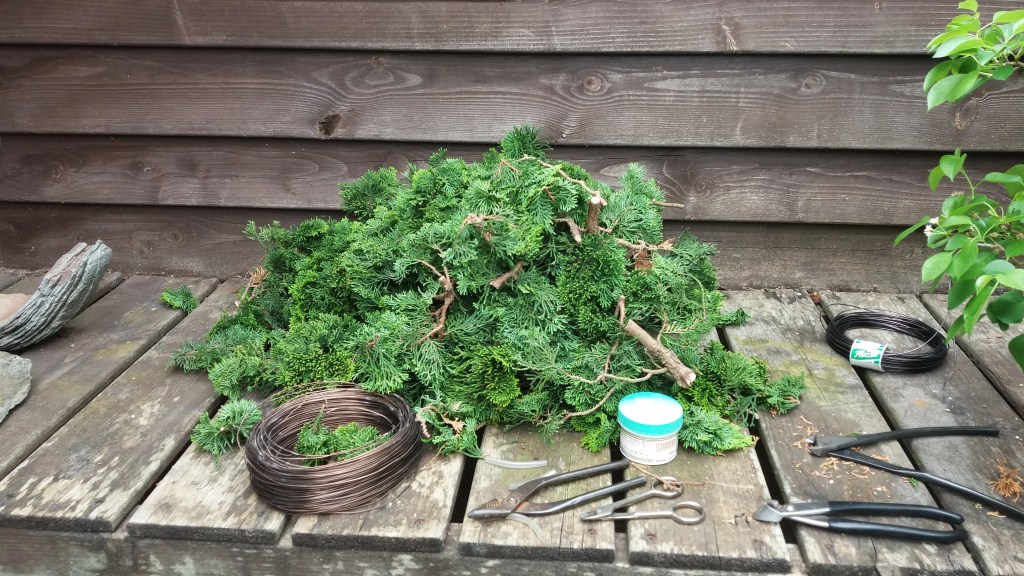 Below: Last year I shorted two thick branches that were growing at the top and just last month I cut off about half of all the too-long branches to open up the inner part of the smaller branches and foliage to re-direct sunlight so that they could gain in strength! Backbudding is always an issue with Hinoki’s and it is a constant struggle to not lose growing power on the inner parts of the tree! Light is a must and cutting back new growth with fine and sharp scissors (never pinch!!!) is a very important task! New growth on older branches is very rare so you don’t want to loos what you got!!!