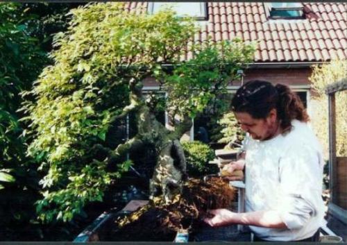 This 111 cm high Chinese Hackberry (Celtis Sinensis) that was imported from China came into my lucky possession in 1993 when I won/bought it for only 875 guilders/ 350 Euro in a foreclosure Bonsai auction nearby Rotterdam in Holland! I could not have been happier to have won this amazing 111cm/43.4 Inch high Tree-like Bonsai! The only problem was that it had to be out of there right after the auctionβ¦and I drove a very small fiat those days?! Luckily a befriended Bonsai trader (Ed de Groot) transported it in his large truck to his EDO Bonsai centre in Blijswijk (NL) where he kindly offered to keep it in his warmed greenhouse during the upcoming winter period! Later in Spring, I rented a truck to transport her to my house. Getting it into my garden was a difficult adventure and I had to remove my garden door to get her inside!