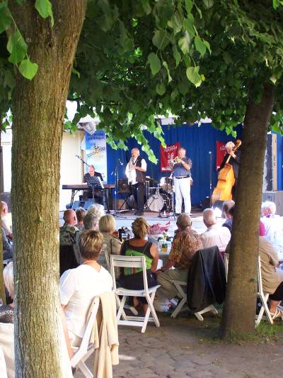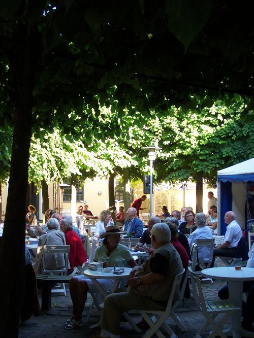 After a long but pleasant drive, during which, many bonsai talks was spoken, we arrived in Aalborg, one of the main cities in Northern Jutland.  The TOMTOM brought us safely to the “Huset” (which means  “The House” ) where this event would take place. My dear friend Morten Albek showed use were to park behind the large old building and after we sad our Halloo’s, he let us through a big old gate into a big courtyard like square, that was completely surrounded by this beautiful ocker coloured square shaped building. We arrived right around dinner time and the smell of the barbecue that was going on made my mouth water, but first a beer! There was a large stage were musicians were setting up their instruments for the show that would start in a few hours and in front of that stage, scattered around the square, local people were having a nice dinner, sitting under old Linden trees, that were planted in a circle (like a doughnut). These stunning trees provided some picturesque shades in the setting sunlight and having your dinner under need them observing the atmosphere of the place while listening to some light Jazz and Blues was a real treat for me! It proved to be a great start to a great weekend.