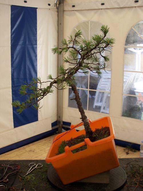 Below: I had a couple of hours to kill Before the Sunday workshops would begin. So Lona Rasmussen asked me if I would style one off here  Yamadori Pinus Sylvestris, she brought along for her own first demo, that she would give that afternoon.  So while everybody was busy for a few hours at the annual club meeting on the other side of the venue, I had some nice quiet bonsai time on my own, while working on her little tree in the morning sun with some coffee.