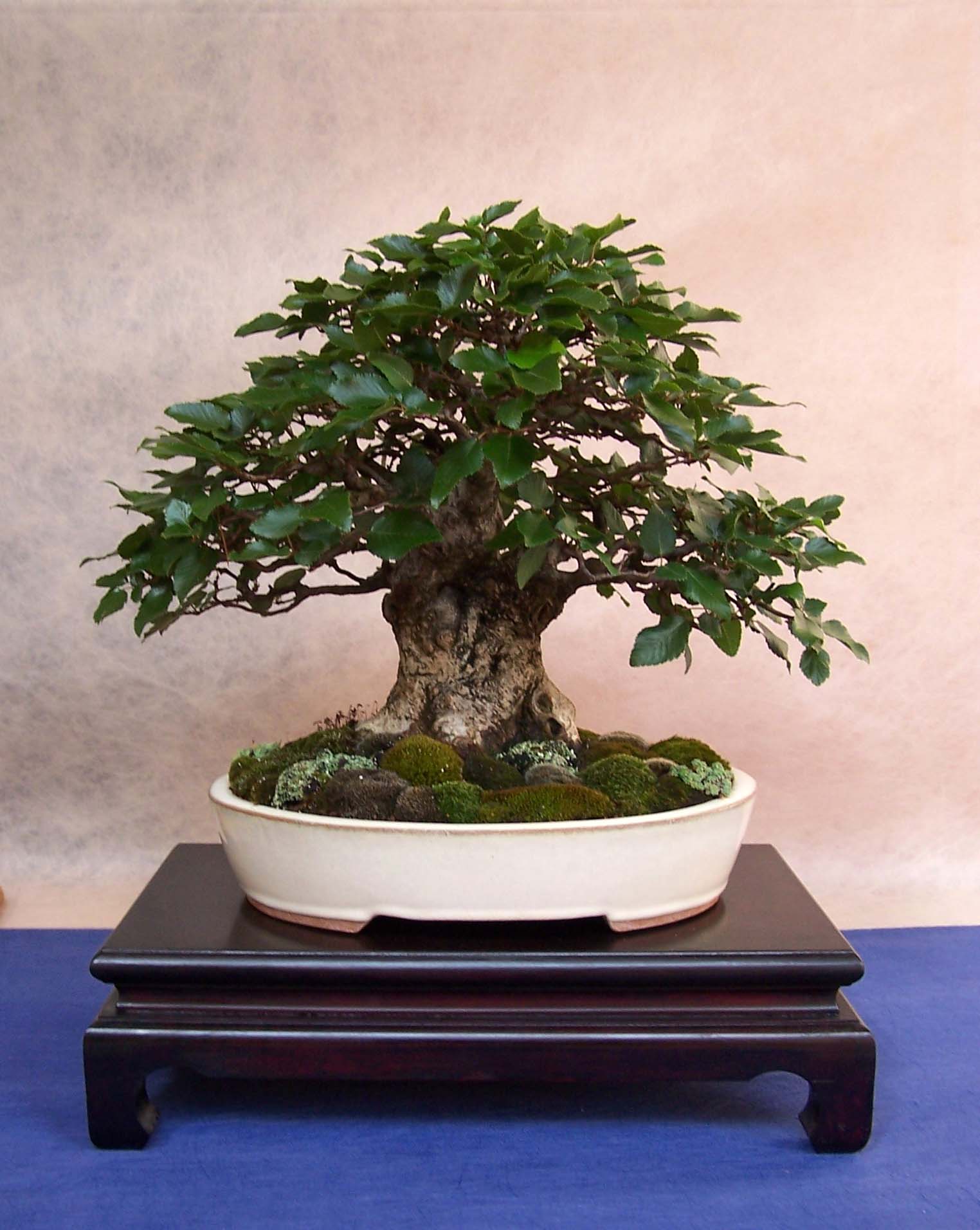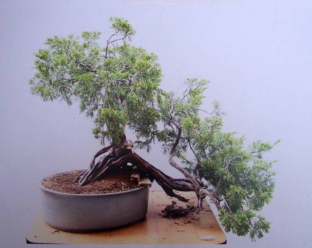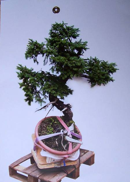 Above: I was proud to finally be able to show my Chamaecyparis obtusa that I have worked on for so many years. Although it is an imaginary tree, Chama’s don’t grow into this style of a tree or any kind of tree for that matter, I do feel that it’s image of an old and bettered tall spruce-fir like tree is believable. To take full advantage of the lovely fan-like shape of this kind of foliage, I styled it not too strict. The wild foliage together with the many different shades of green creates the feel and image of a tree in the distance. This tree has come a long way indeed!