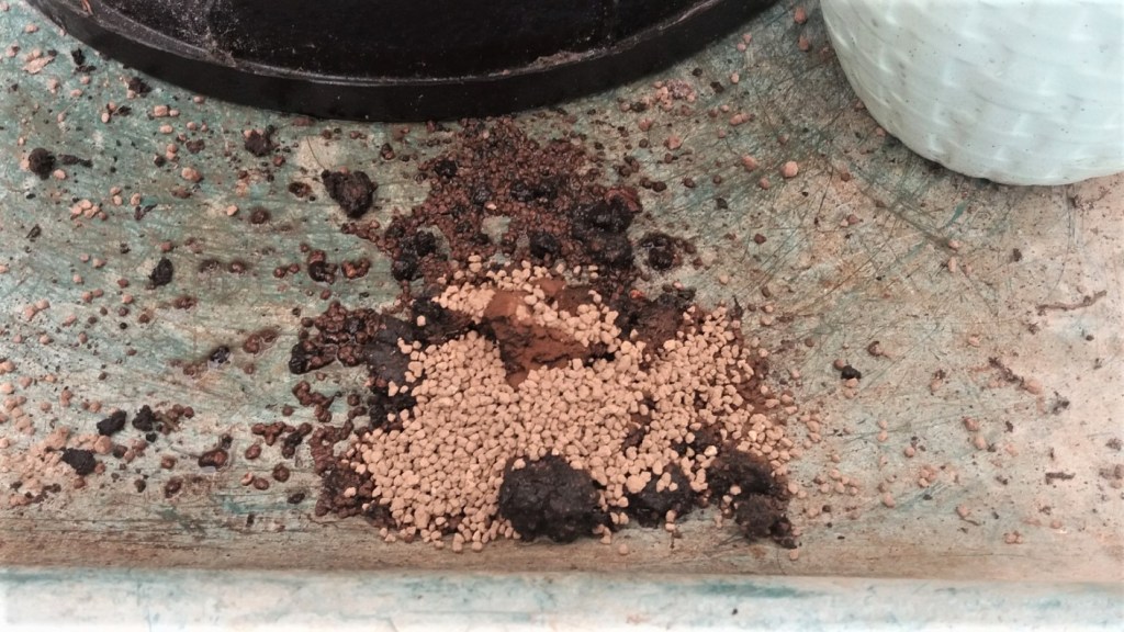 Above: May 2022. The Juniperus Sabina from this warning! It was shot just before I inhaled the pollen cloud while working on it! In the left bottom corner of that large brown wooden plate, just below that cut-off branch, you can see a few of the tinny brown pollen pods that made me so sick!