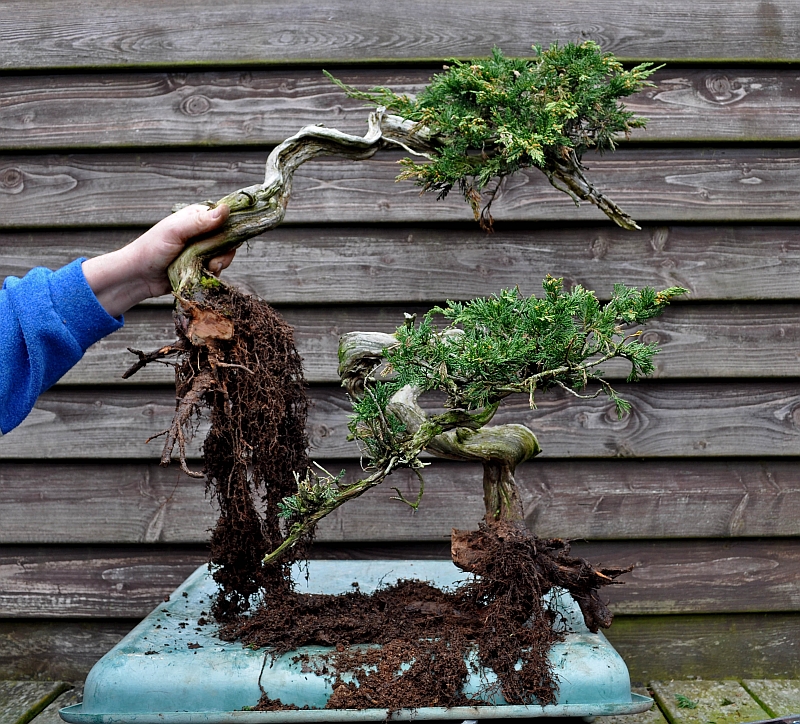 A few days ago I happily started to give my 5-trunks raft Winterberry or Ilex verticillata 5 trunks raft its yearly springs haircut when I noticed to my horror that many small and some ticker branches had died during last year’s reasonably mild winter?! So I had no other choice than to get him out of its beautiful “Isabelia” pot to look if something was wrong with the roots?! And what I discovered was that a lot of the older soil was not all removed during its last repotting and had become compact and socky underneath the large base! Many other roots that did have room had become long, leggy and without many feeder roots circulated the whole pot!
