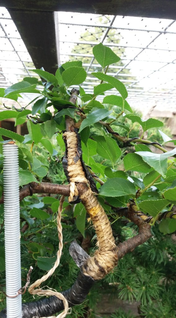 Some months ago I discovered to my surprise that for no apparent reason a lot of the smaller and even some thicker branches had died back on my 5-trunk Winter Berry (Ilex verticillate) raft. So I took it out of its pot and discovered that the very compact rootball had a lot of very strong fleshy long ones growing around the outside and dos smothering the smaller important feeder roots and blocking the holes in the bottom of the pot! I had noticed a few of these long useless thick roots before during an earlier repotting and simply removed them! He was doing just fine back then and showed no ill effects after the removal of those roots?! So to get the tree back to that former so obviously good health I must stop these useless killer roots from coming back! So I decided to make my own special homemade “air pruning pot” for it to grow in for a season or two! Because, when plants/trees are growing in a pot that allows the air to penetrate through the holes in its walls, like in the makeshift plastic mash pot that I made, roots will never grow to that length and/or thickness. Why do you ask? Because as they grow and reach the bottom and the sides of the pot, they are naturally pruned (dried up) by the air, which forces the plant/tree and Bonsai to sprout new, fresh roots that in turn penetrate deep into the depths of the soil. I had an old open-structure plastic food/fruit crate that has just the right sizes! I covered the inside with the famous black gauze we use to cover the holes in our pots with! 1 mm wires were used to hold it in place. Below: The finished makeshift open-air Bonsai container!