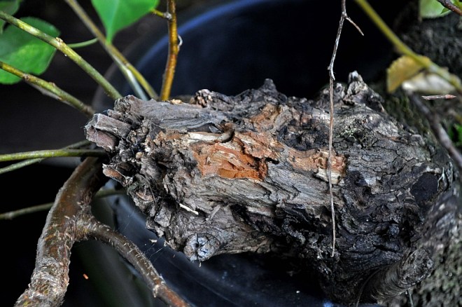 Below: This is the stump that was left after the air layering was removed two years ago. It has been worked a little before with hand tools to reduce it, but it is still too bulky and massive for my liking so time to remove some more! The branch you can see on the left grows from the back of this deadwood and will be shortened in the future when it is thick enough, leaving a cascading branch appearing from behind that deadwood.! The 4 small branches that you can see growing upwards from it are crafted onto it last year, they will create in the future a small grown just above this deadwood