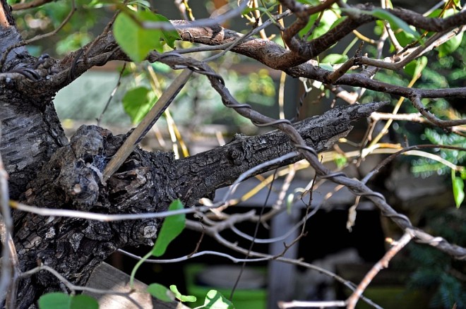 Below: The tree consists of left and right sections with a strip of deadwood running in between from top to bottom. A year later, when the tree was looking very vigorous, I decided that it was safe to perform a drastic pruning! So I cut off all the foliage and branches from the left section of the tree, leaving the stumps so that they could be turned into Jins. And I removed all the bark from that left section, creating a nice contrast between the live (brown) section and the deadwood (white) section! The branches that were useful for my design were wired and then the tree was left alone (as long as it needed) to recover from it all!
