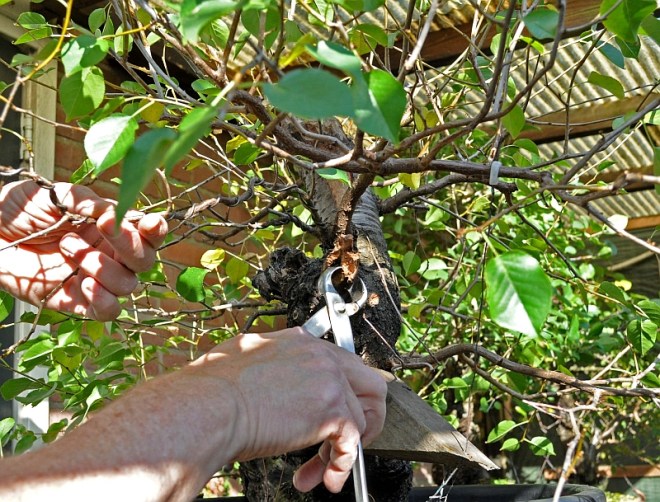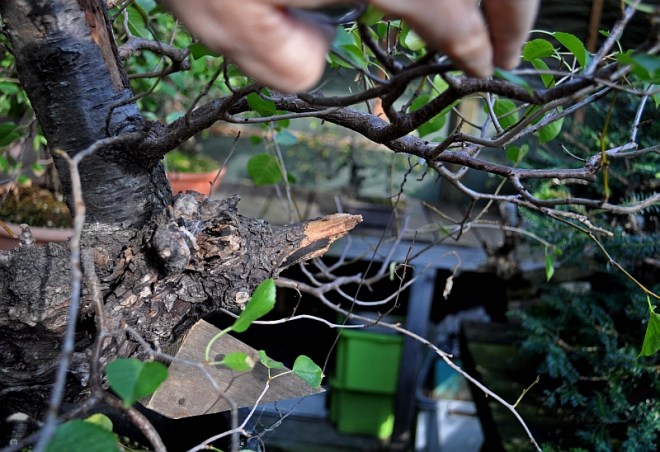 Below: After cutting and pinching. The copper wire in the top of that Jin is there to prevent it from accidentally breaking when I move it around! My garden is covered with galvanized iron gauze (normally used in concrete walls), so a mistake is easily made when lifting up a tree too high!