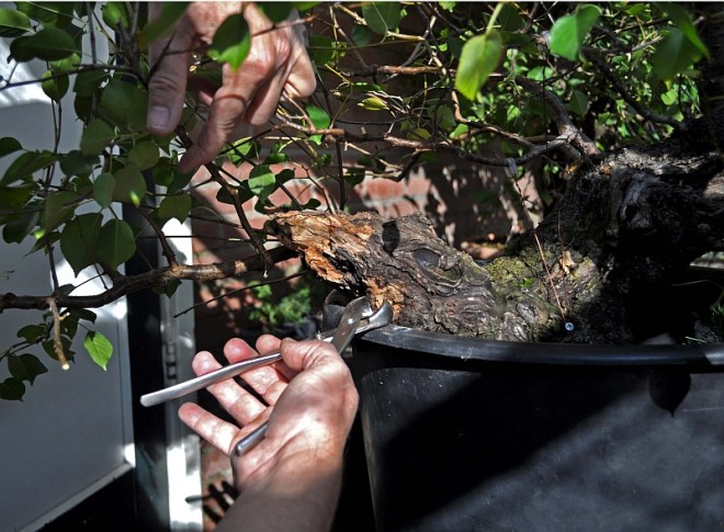 Below: next the straight trunk is prepared to go into its new home. Here a long thick death root is cut off so that it will fit easier in its pot.