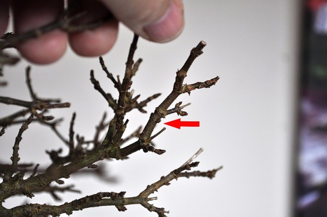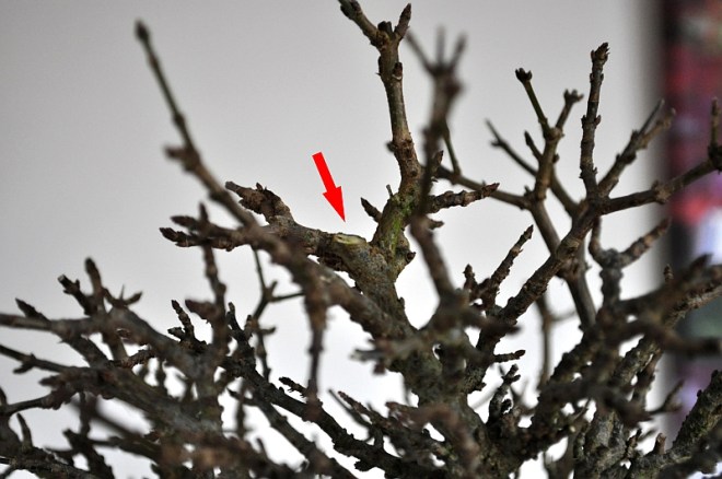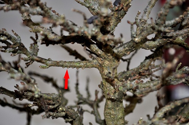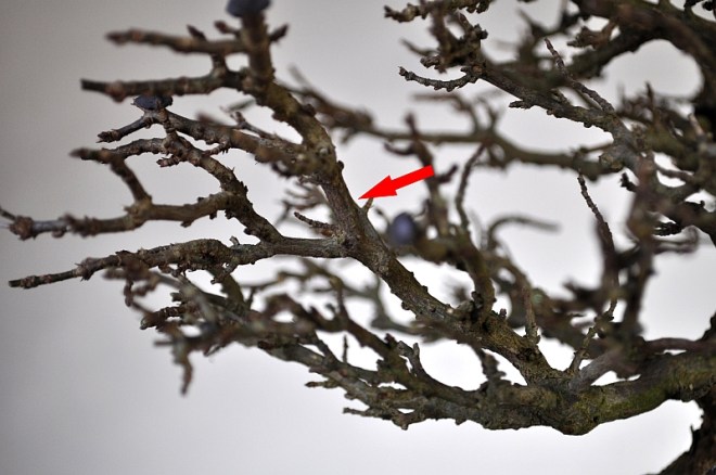 Below: Arrow points at another to long branch with not enough taper. It will be cut back to the nice side branch, just left below the arrow.