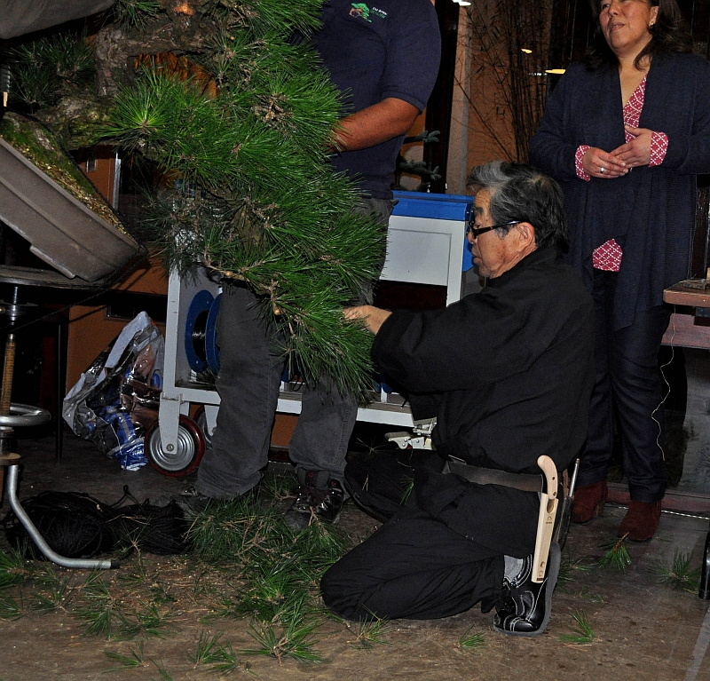 Below: From another student came yet another beautiful Yamadori pine! And again with some problems to solve and big decisions to make! But I had no problems convincing the owner and the rest of the students how to proceed to solve them and to bring the best out of this, once again, beautiful and exciting Yamadori. That long downward Jin needed to go because it distracted the beauty of the abrupt movement of the trunk line in the top section! This was mostly caused because it protrudes from the inside of the curve in the trunk its top section and like with branches that grow from the inside of a curve in a trunk they almost always look misplaced and disturbing! Also two Jins on the lower section of the trunk needed to be reduced because they were distracting and other Jins and the Shari needed to be styled! Then the top main branch was protected by a layer of raffia and wired before everything could be put into place and that sounds easier than it actually was because the top section needed a lot of heavy bending!