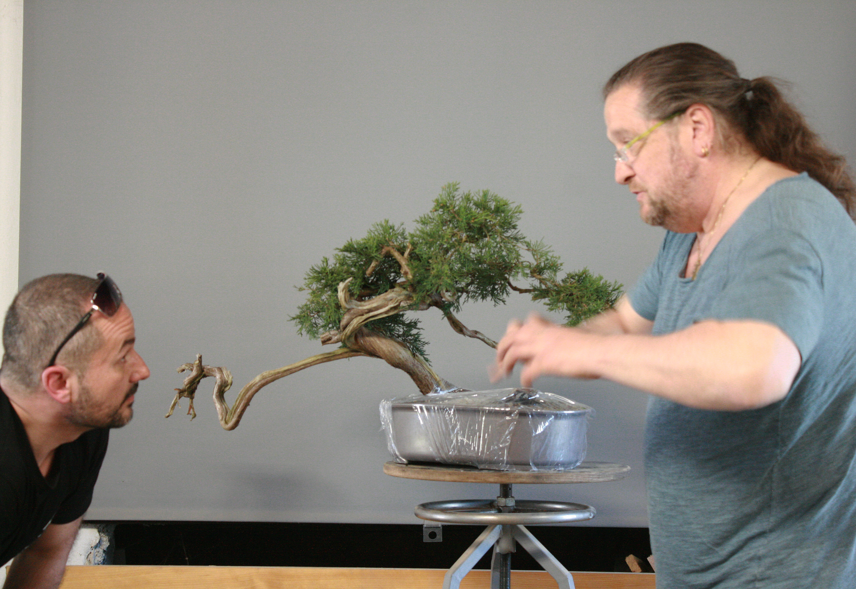 Below: Before the actual work on the brought-in trees started I first discussed them all with the owners in front of all the students. So that everybody could learn from each and every tree! This is a very valuable part of the workshop for the student and very exciting for me to do! This Juniperus sabina Yamadori was after I discussed the possibilities styled by two Croatian students with the help of Tomaz himself and the end result is pretty impressive and promising indeed!