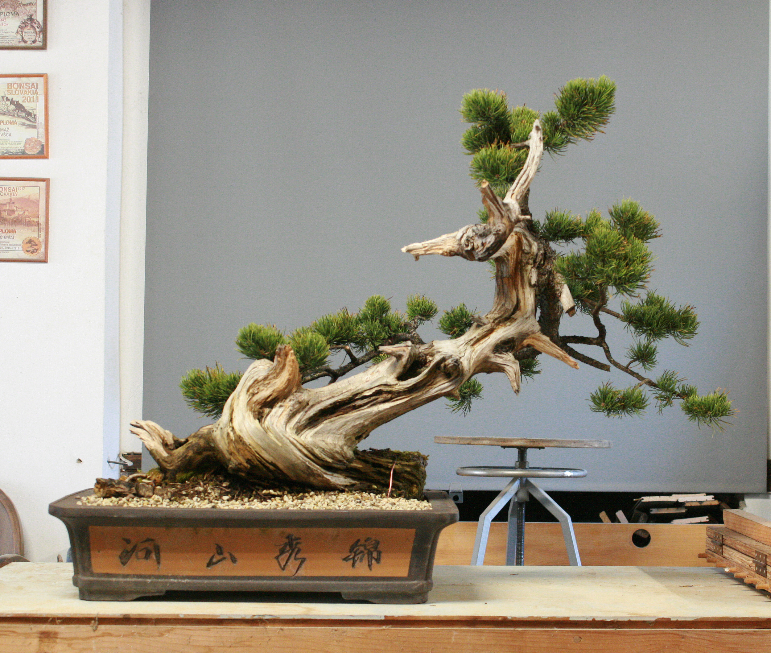 Below: My old friend Roland Petek brought in two mindblowing Mugo Yamadori Pines with him! This one has amazing deadwood all along this side, but still, we selected to style it with the other side as its front. This site would always look like a Tanuki and that is not what you want for your Bonsai…especially a Mother like this one!!!
