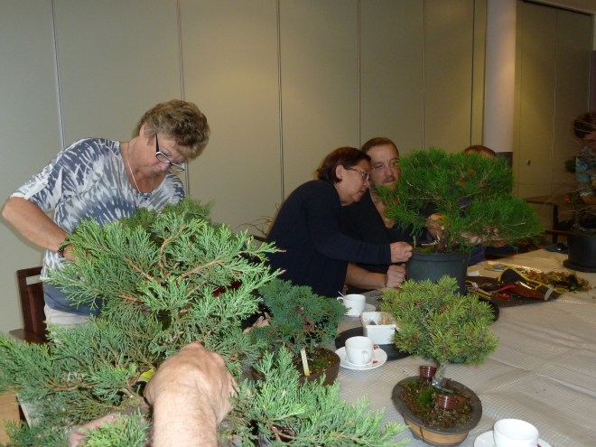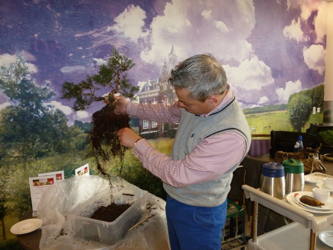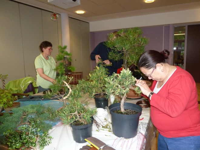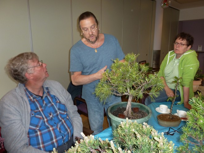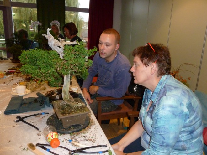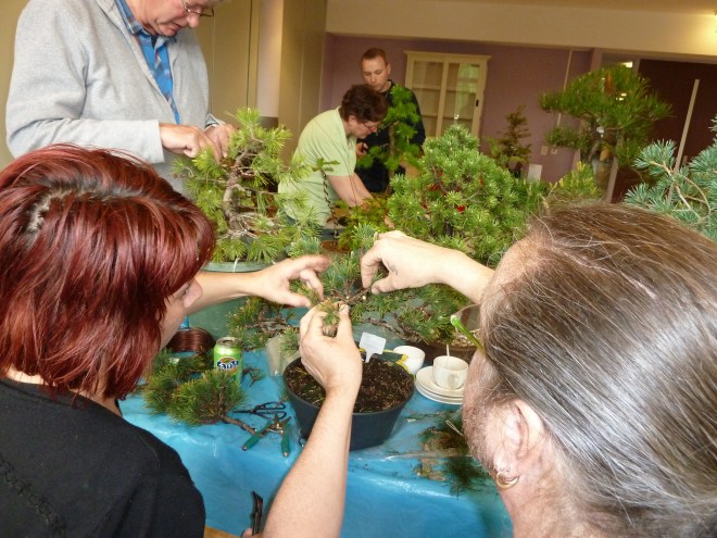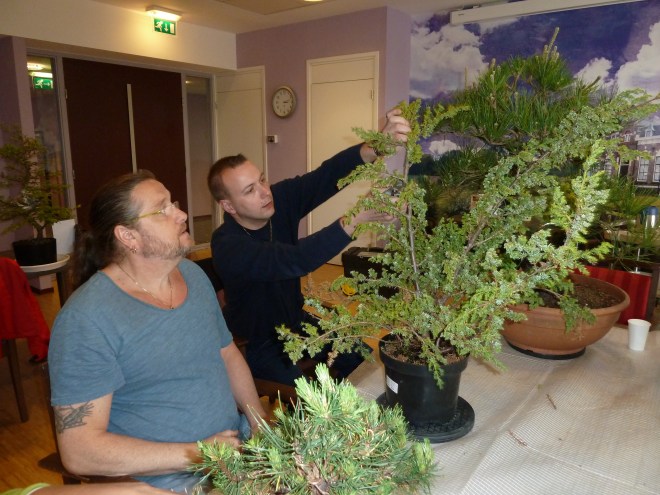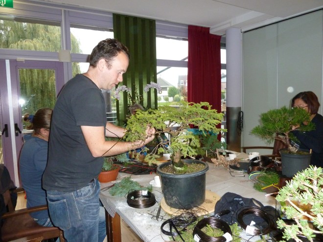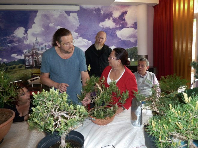 here are some fun pictures of my recent workshop that I did in Poortugaal (Holland) this year. Every workshop started with a little lecture from me about Bonsai subjects. Ranging from: fertilising, wiring, styling, soil and Pine care. Everything, text, pictures and my drawings are printed out by Marijke for the students to take home! The first 6 workshops I did this year, were just like last year, staged by and for Bonsai Club “Rijnmond”. But after those were finished, the students were so enthusiastic about them that they asked me if I could stage one more, focusing on the subject of Pine care?! Covering Pine Candle selection, pinching, needle removing and styling? Well, last Sunday it took place, after the great help of my trusty organiser and helper Marijke, who was able to rent the workshop space again for us to work in! The pictures that Marijke made that fun Sunday give a good impression of the 8 students and the teacher having a wonderful time again! So much so, that jet another one is planned by us for July, and that was booked full to the 8 max in a flash!!! 🙂 And that made them and me very happy again! I love to work with students on their babies! It is very fulfilling work to pass on what I know! I hope you enjoy this little impression of the great hobby that Bonsai is for us?!