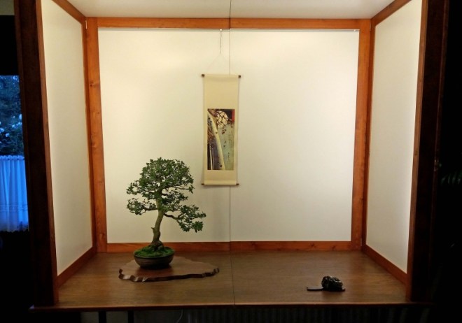 gisteren heb ik een Boom bespreking gehouden bij mijn eerste Bonsai vereniging “KOYA” in Rijswijk. Ik ben daar lid geworden in de begin jaren negentig en ben er zo’n 6 a 7 jaar gebleven. Gedurende die tijd heb ik met Farrand Bloch en Rene Rooswinkel (van BonsaiFocus) en veel vrijwilligers van KOYA een van de eerste grote Nederelandse Bonsai shows georganiseerd. Tevens was ik een tijd hoofd van de activiteiten commisie en ik gaf er mijn eerste en tweede domonstratie ooit! Die eerste demo boom een tuin centrum “Chamaecyparis nana” won een paar jaar later de land dagen en heeft nog op de “Ginkgo Awards” en de “Crespy Cup” gestaan. Onnodig om te zegen dat ik leuke herrineringen heb aan mijn tijd by KOYA, dus het was fijn om eindelijk weer eens terug te kunnen gaan om de leden te helpen met al hun vragen over de verzorging en het stijlen van hun Bonsai. Ik werd bij de ingang verwelkomt door een hele mooie portable “Tokonoma” met een hele mooie en volwassen Steeneik (Quercus Ilex) en een prachtige scroll met een winter motief en een goed bij passende Suiseki. Ik had een fantastische dag en hij was voorbij voor dat we er erg in hadden! De reacties waren erg positief en we zijn overeen gekomen dat ik begin volgend jaar terug kom om een workshop te geven. Na een erg hartelijk afscheid ging ik moe maar voldaan weer op huis aan. Bedankt “KOYA” voor jullie vertrouwen en warm welkom en hopenlijk tot volgend jaar maar weer?!