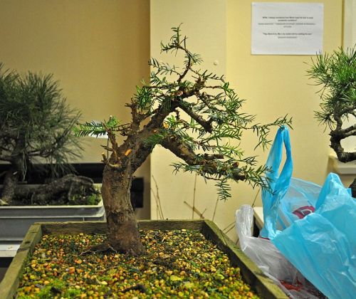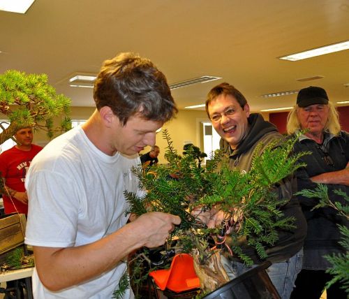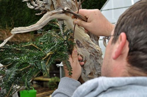 ) brother again after a long time and from that moment on my mindset went from gloominess into a bright feeling of belonging and happiness, I was home! The first thing he proudly showed me was his new allotment were his young student and friend Mikey had to spend all morning laying large and heavy concrete tiles in the mud so that we and all the other later visitors of Burrs could walk among the amazing yamadori material that Tony had gathered over the last couple of years. Poor Mickey was soaking wet and there was not a clean spot left on his clothes! Over the next two days, Tony took groups of Burr’s visitors up there and understandable many off this unique yamadori later ended up on the working tables at Burrs to receive their first preparations or styling! After my visit to his place Tony took Mickey and me to his home for some needed refreshments (B.L.T’s) and then we made our way to the back of his garden to look at his collection and to work on some of them. Together we wired and worked/styled his small yew that naturally grows in/from a massive and very heavy rock, this made the Bonsai juices in my body go faster than they already did! But on Friday the real deal started big time, Tony had placed his enormous and mind-blowing yew on a large and solid stone table in the middle of his back garden and while the teachers and guests slowly dripped in Ofer, all the way from Israel, started to pre wirer the largest branches of this monster. Mean while inside his glasshouse Will and I started to work on Tony his white pine and not much later it’s old needles were plucked by 4 pairs of hands!