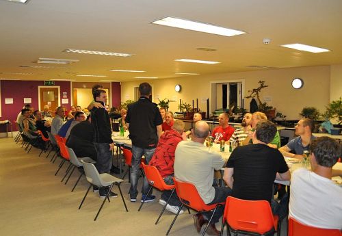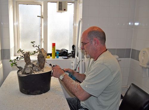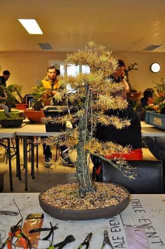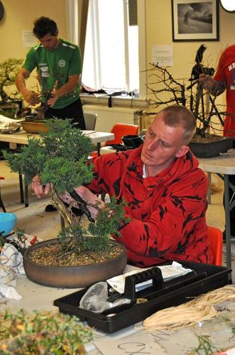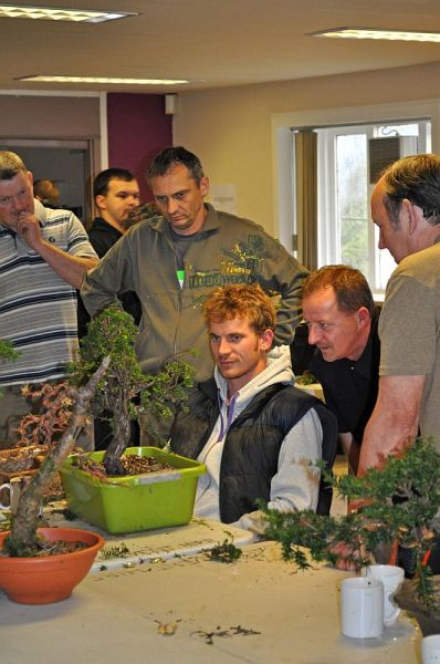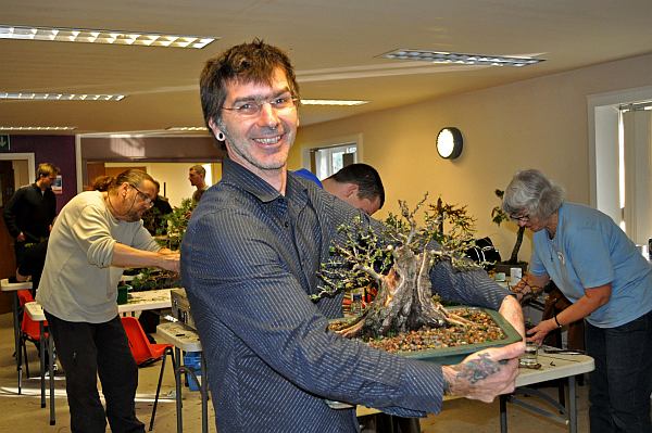 Saturday morning, the real start of Burrs, was for us teachers like we had worked together for years! Enrico found his way to the better trees that needed to be designed and Pavel and Terry found their way to the somewhat lesser trees that needed to be designed. I mostly helped the students with their techniques and questions: like how to select a front, back and total design. I must have made 8 or 9 design drawings that helped them on their way. I showed them how to select the branches, how to wire them, how to bend (some extremely) heavy branches and all the rest you need to know to design and make your future Bonsai. And a lot of the student’s trees that I worked on or helped on, just started their lives as a Bonsai and only needed a good start and could not be finished this weekend. That is why there are not too many pictures of finished trees that I worked or helped on! A lot of the students had a question that needed to be answered and needed help with their techniques and this time it was me to (gladly) take that role! Working this way together meant that everybody was helped this weekend! And wood chip Will helped almost everybody with their death woodwork, this meant (because off the dust) that he unselfishly spend and worked most of this weekend hidden away in the disabled toilet while the tree’s owner looked over his shoulder. The only times we saw him was when he covered with wood chips and dust came out too quickly eat and drink! Now that’s dedication for you!