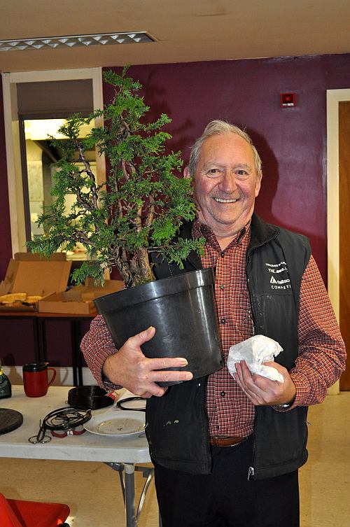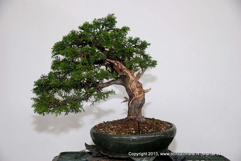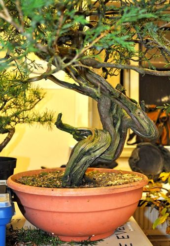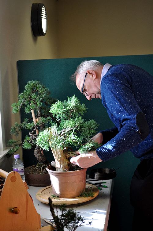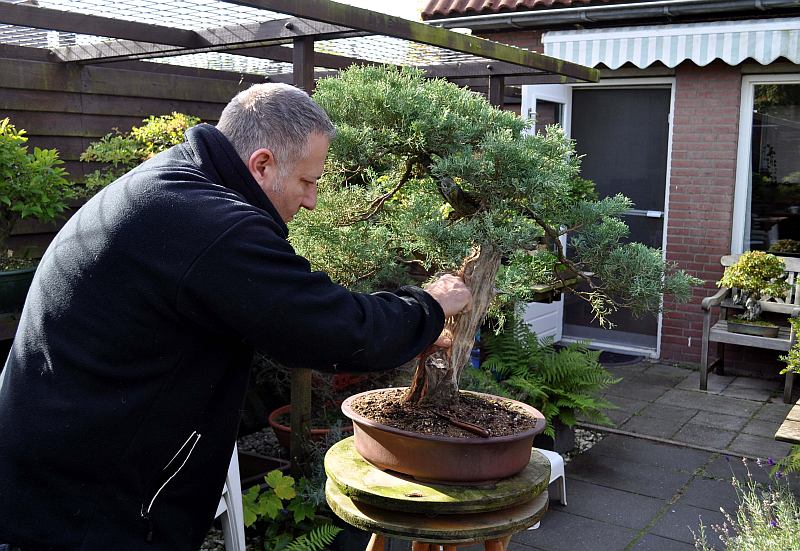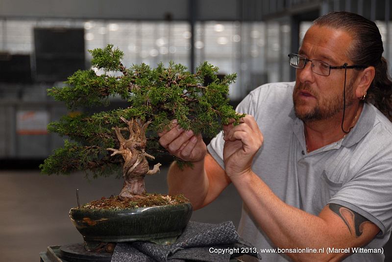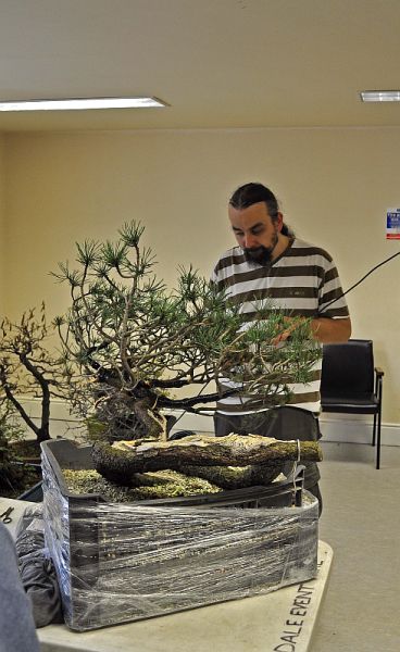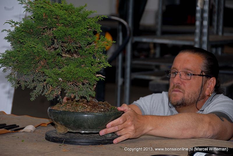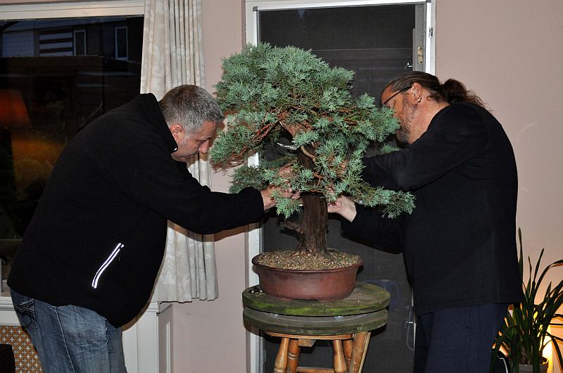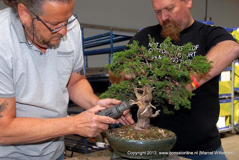 Below: New friend Mikey with his yamadori juniper that he acquired last year from me when he visited my house with Tony the day after the Noelanders in Belgium. Mikey wanted the foliage, that is still hidden behind the trunk in this picture, in front of that same trunk! Now, this was an almost straight tree when I got it many years ago and I had bent, purposely broken and twisted it severely over the course off 8 years, so although the wood was very hard and there even was deadwood running along it, I knew that it would bend again! And when Enrico told Mikey that it would not be possible to get into his desired space without splitting it…well then I was, even more, determent to do it!