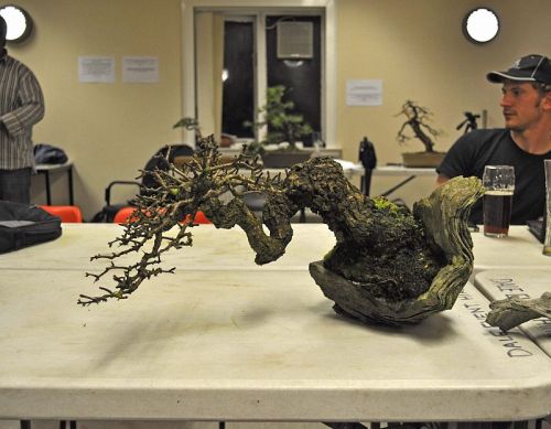 I must admit that I was a bit nervous (after all that tasting in large quantities) about my Saturday night lecture, but it turned out to be my finest hour! For the last 17 years, I have been working on a simple but mostly unknown technique that hides and masks different large wounds on trees. With the help off progressing drawings I tried to explain this (as far as we know) unique technique and the many positives reaction and all the questions I got during my presentation proved that my nervousness was not necessary at all! The many OOOOS and AAAAAS that I got when I showed the drawings and the pictures off the final end result of my technique on my own trees made me really proud and very happy, because it means that I created and developed a technique that can help every Bonsai enthusiast, be it pro or beginner, to improve there work and their Bonsai! During and at the end of my lecture I got a lot off new ideas and possibilities back from the audience and that shows that there is really no end to all the possibilities of this simple technique! So I am already looking forward to the next edition of Burrs so that I and the rest of the gang can hear the outcome of everybody that was here and is about to use my technique on their own trees in many different ways!! In a few weeks time, as promised a while ago, my technique will first be published by The Art of Bonsai Project forum, I will place a link here and on my blog and on my own Karamotto Bonsai website as soon as AoB Forum has posted it online! After that first publication is don and it had enough time to be red by their visitors, well then it will be posted on my own Karamotto Bonsai website for all to see and use as they please!!! And I really hope that my technique will open much more possibilities for all Bonsai artist that will use it in the future! That same evening Tony made a great presentation about the styling of his big Escallonia and his trip that he made to Pavel and to Israel with Ofer! And Mikey finished off the evening with his story in picture and words of his trip trough Bonsai wonderland in Japan!