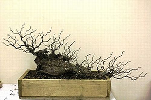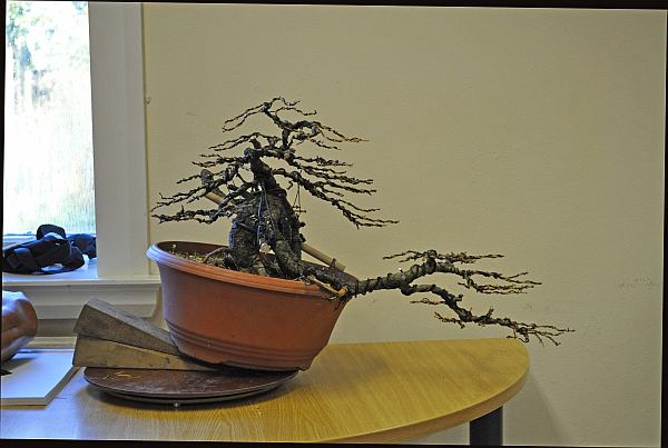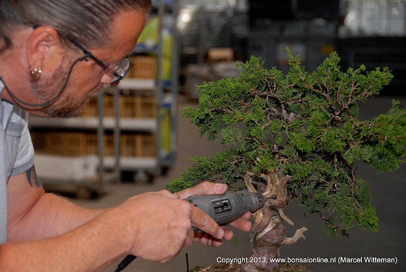 This all happened with the sound of classic FM in the background and was all professionally filmed! And I am really glad about that because the styling of this tree is something to be seen by all bonsai enthusiast around the world! After Tony and Enrico (Italy) discussed the possibilities and what to do next, and just before the inevitable English rain started to fall big time, Tony performed a daring technique on one of the thick and almost on bendable branches. At the base of a section of about 6 cm, this branch was halved, leaving it half as thick as it was! Then holes were drilled in both the thick sections above and under the now thinner section. In those holes, thick wires were inserted to protect the branch from breaking when it was placed in its desired place.