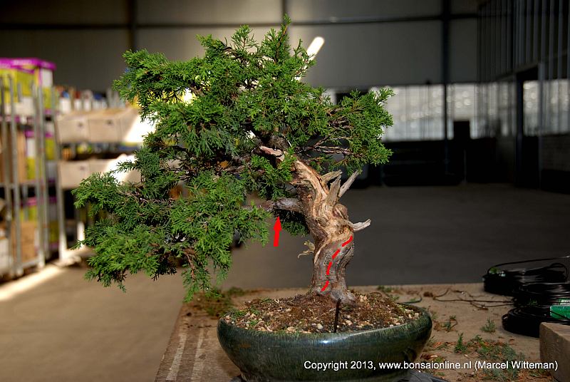 So when Mikey was a way to help Tony I secretly applied wed raffia and then placed 2 pieces off thick copper wire lengthwise along the outside off the future curve and then that was covered again with a layer of tightly wrapped raffia. And then a thick copper wire was tightly applied over that all in the usual way. Then I slowly and carefully started to bring the top underneath and then in front of the trunk, while all the time praying it would not break!