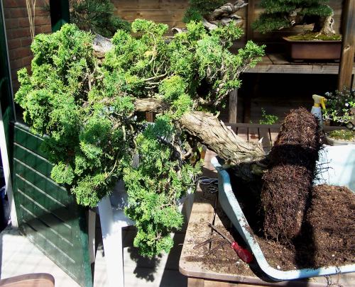 Above: Cleaning the deadwood. Because this tree was a bid lose in its pot, I secured it as well as possible to the table. But even so, the cleaning work was kept to a minimum to prevent any damage to the roots!