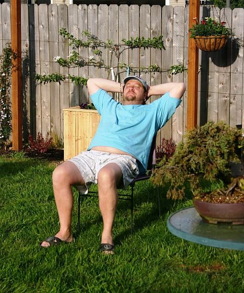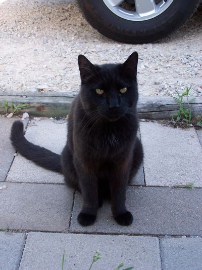 Above picture: I took this picture, right after I collapsed, tired and warm, on the steps leading into Irene’s house. The only place around with some shadow! I was so glad to take a load off and get a breather and some cold water into me! But immediately after the first small refreshing drink I took I looked down, alarmed as I was, by that small warning bell in my head, that got stuck forever in the back of our minds, since ones long ago some guy with thick eyebrows, saw his confused grandfather trying to path an innocent looking “Sabretooth on the head”! Suddenly, there in front of me, out of nowhere, sat “BRUN” (short for “BRUNO”), the oversized alpha male of the “Irene’s cats clan” who is well known to tackle deer and wrestling moose! Which, he then often leaves on Irene’s and Terry’s front porch as a token of his affection for them! “BRUN” is contemplating here, without blinking, if he would eat me, or just play with me a bit…before eating me anyway!
