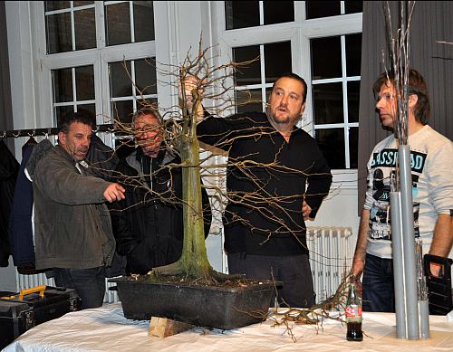 Below: Both old Prunus mahaleb had grown amazingly during the past season and the wire had to be taken off before it would dig into the bark! But the branches did have enough time to grow more or less into their desired position and stay there! Now it was time to loosely rewire all branches again and to reposition them where necessary!