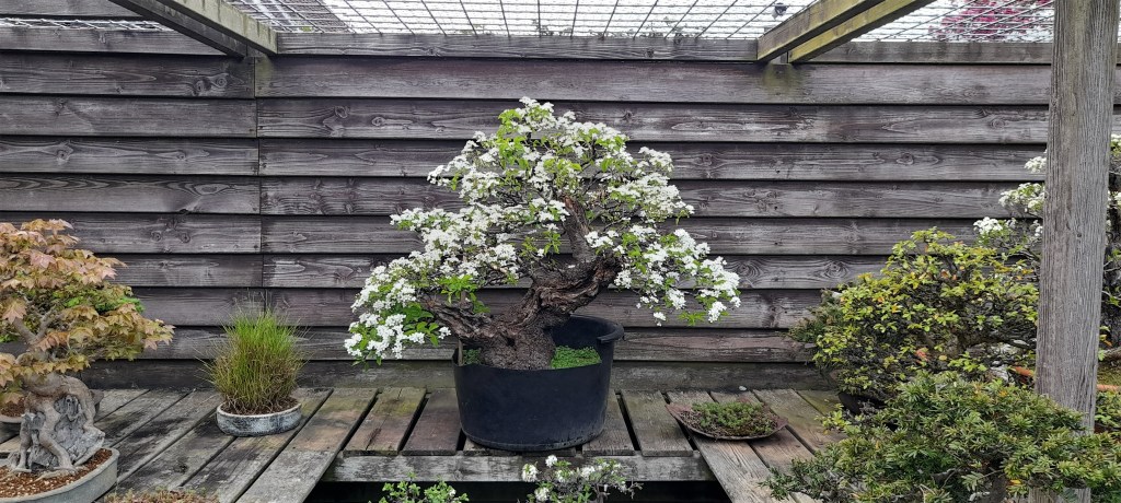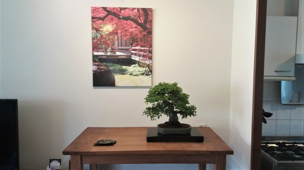 Yesterday was a perfect warm sunny day and I had a very welcome visit from my oldest Bonsai friend Teunis Jan Klein (NL) who runs the well-known Bonsai centre “DESHIMA” in Nieuwe kerk aan de ijsel (NL). And is a great award-winning artist and teacher! So I created a simple welcomes display in my living room on my high work table. In the background is a print of a picture that I made of the famous Red maple in the amazing Japanese garden in Portland Oregon. I worked this picture over with my paint program so that it looks like it was painted on canvas. The tree is one of my Hawthorns Yamadori (collected tree) that I found in Wales with Tony and Terry in the middle nineties. It has been in several shows over the years and she turned into a grand old lady that lives in a very special Dan Barton pot that he gave to me as a gift during one of my very memorable stays in his and Mom’s lovely place in the (U.K). I miss those days of being able to travel and meet all those different Bonsai friends! ( I will make a better shot of that special pot and post it!) ( If I don’t forget that is…?) (FORGET WHAT????).